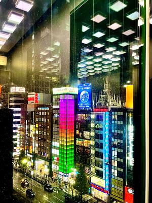 Tokyo, Japan. The view taken while taking a glass walled elevator, up to dinner. Reflection of the elevator's ceiling lights are there as well.