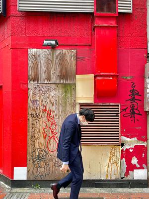 Tokyo, Japan. I'd stopped to take a photo of the colors and patterns of the wall, and this gentleman passed by. He was being kind and tried to duck down out of the photo...without success.