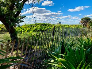 Del Ray Beach, Florida. I was on a business trip, staying at a hotel across from the ocean. As I waited for a taxi, I stepped across the street and took this photo. The compositiion was too good to avoid! (The ocean is just beyone this foliage).