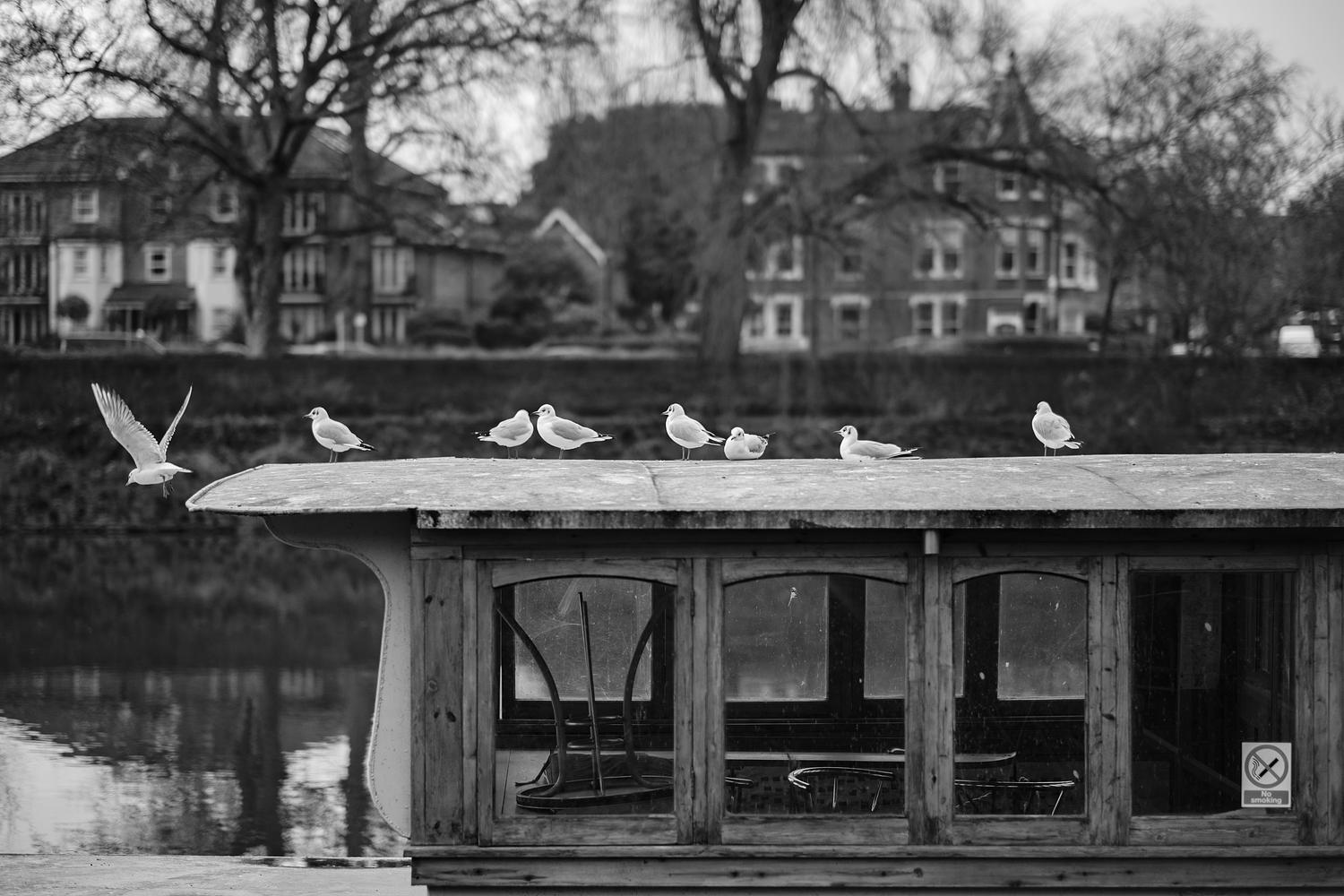 Richmond Upon Thames. Walking along Thames river and seeing the birds on the boat. As I composed the picture, the one bird flew off, which made it a better photo.
