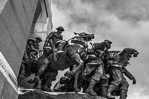 Ottawa, Ontario; Canada. National War Memorial. Located near Parliament. Originally build to honor all those who fought in WWI, it is now dedicated to "Every Canadian killed in battle". Opened in 1939. Sculptor Vernon March. The soldiers are passing through to enter battle, without glorification. A bronze sculpture and granite archway.