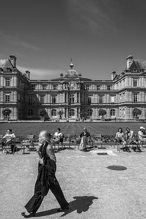 Jardin du Luxembourg, Paris. Lunchtime during the summer. The building is the Luxembourg Palace, built 1615-1645...to be the royal residence of the regent Marie de' Medici, mother of King Louis XIII. It would later become a legistlative building. The photo captures the Paris lifestyle, which I exprienced when living in Paris several years ago. (I tend to time a person's walk in a full stride, a better silhouette.)